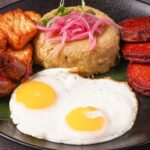 Puré de plátano, salami, queso frito, Longaniza, cebolla encurtida, huevo frito. Mashed plantain, salami, Dominican sausage, fried cheese, pickled onion, fried egg.