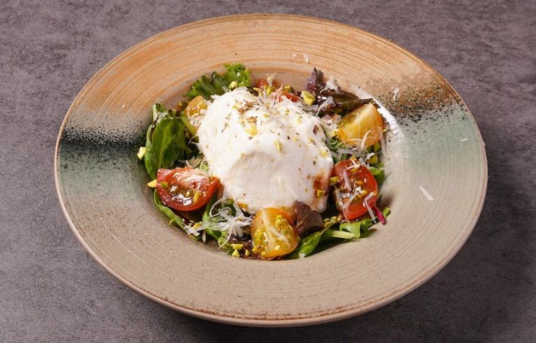 Burrata, spring mix, Cherry tomatoes, Parmesan cheese with vinaigrette. Pistachio topping. Please inform your server of any allergies to nuts.