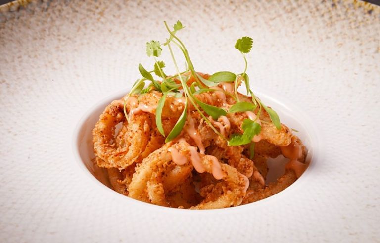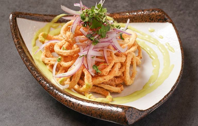 Calamares marinados en cerveza Presidente, enharinados y fritos, acompañados de mayonesa de sweet chili, limón. Calamari marinated in Presidente beer, lightly floured and fried, served with sweet chili mayo, lemon, and micro cilantro.