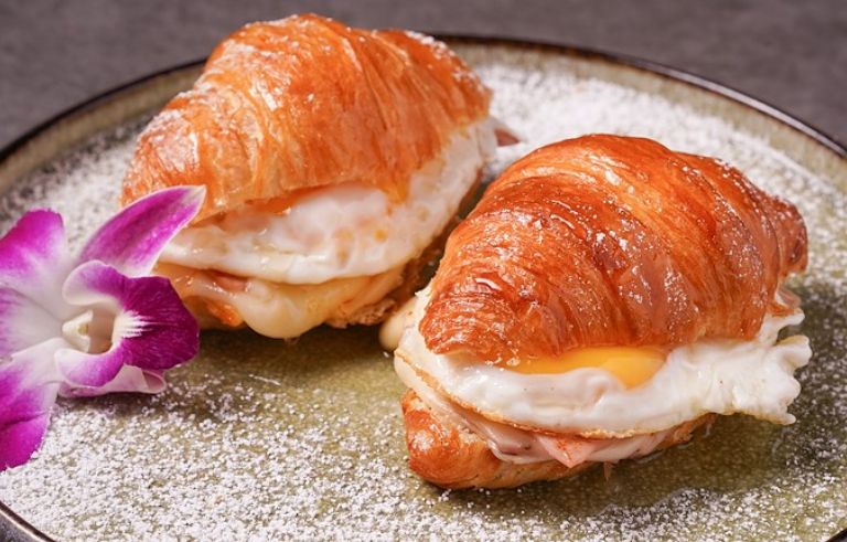 Croissants with Sunny-side up eggs, ham and cheese. Topped with an Agave drizzle.