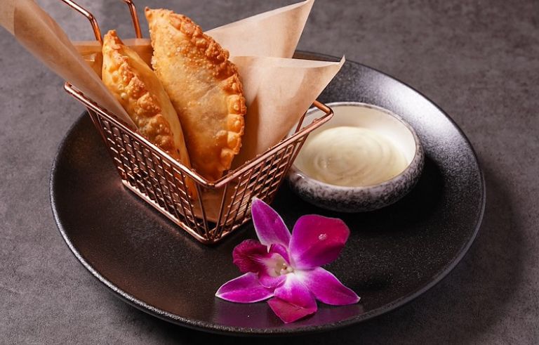 Empanadas de carne con queso y pollo con queso, acompañadas de salsa verde. Beef & cheese and chicken & cheese empanadas, served with green sauce.