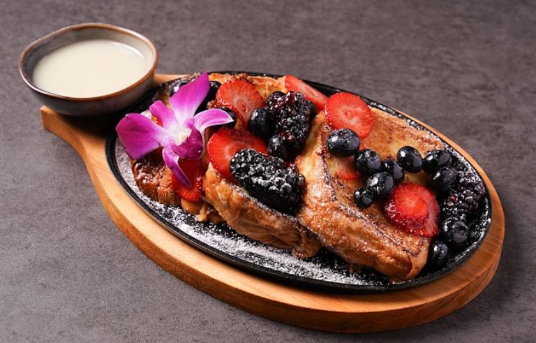 Tostadas Francesa con arandanos, fresas, zarzamora con chocolate Blanco deretido. French toast with berries topped with white chocolate syrup.