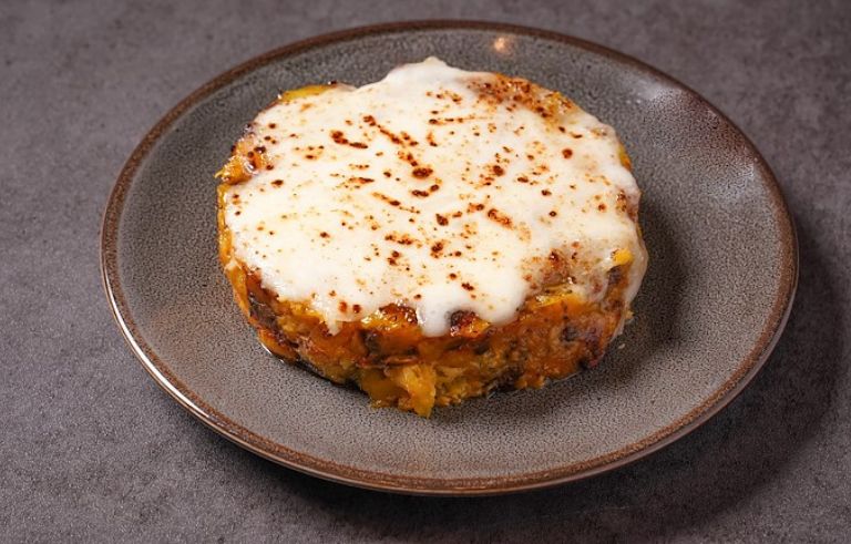 Pollo relleno de jamón, tocino, queso y plátano, empanizado en panko, servido con salsa de queso y puré de papa. Chicken stuffed with ham, bacon, cheese & plantain, breaded with panko, served with cheese sauce and mashed potatoes.