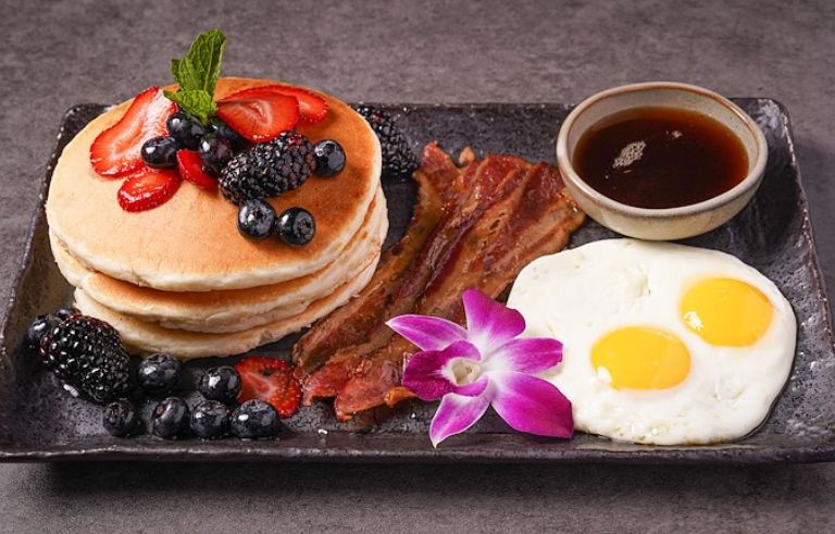 Pancakes con fresas, arandanos, tocino y huevo Frito. Pancakes with berries, bacon and sunny-side up eggs.