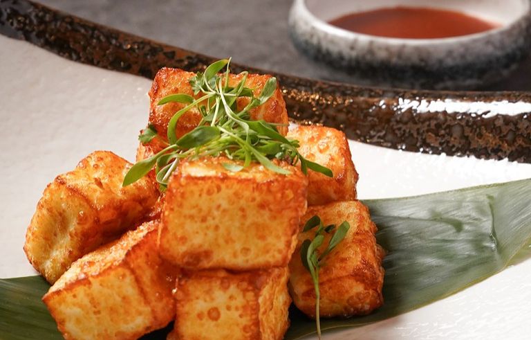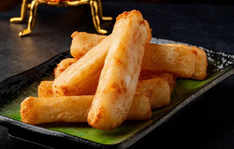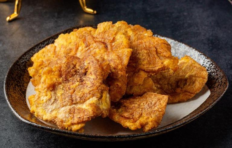 Crispy twice fried green plantain, tossed in garlic butter, kreme sauce
