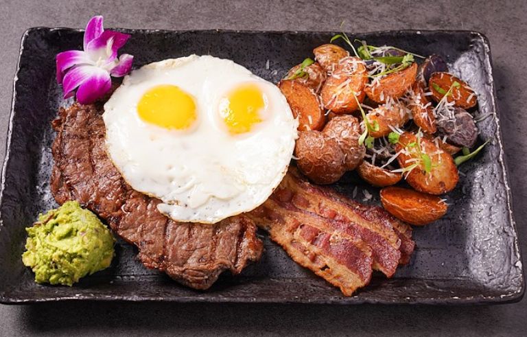 Picanha, tocino, guacamole, huevo frito, papas rostisadas con queso parmesano. Picanha, bacon, guacamole, fried egg, roasted potatoes topped with parmesan cheese.
