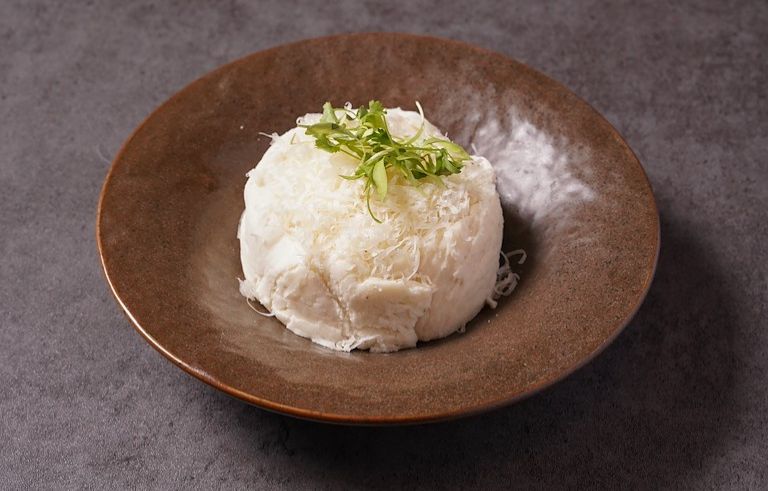 Mofongo de plátano verde con ajo y chicharrón crujiente, terminado con salsa blanca de la casa. Green plantain mofongo with garlic and crispy pork belly, finished with our house white sauce.